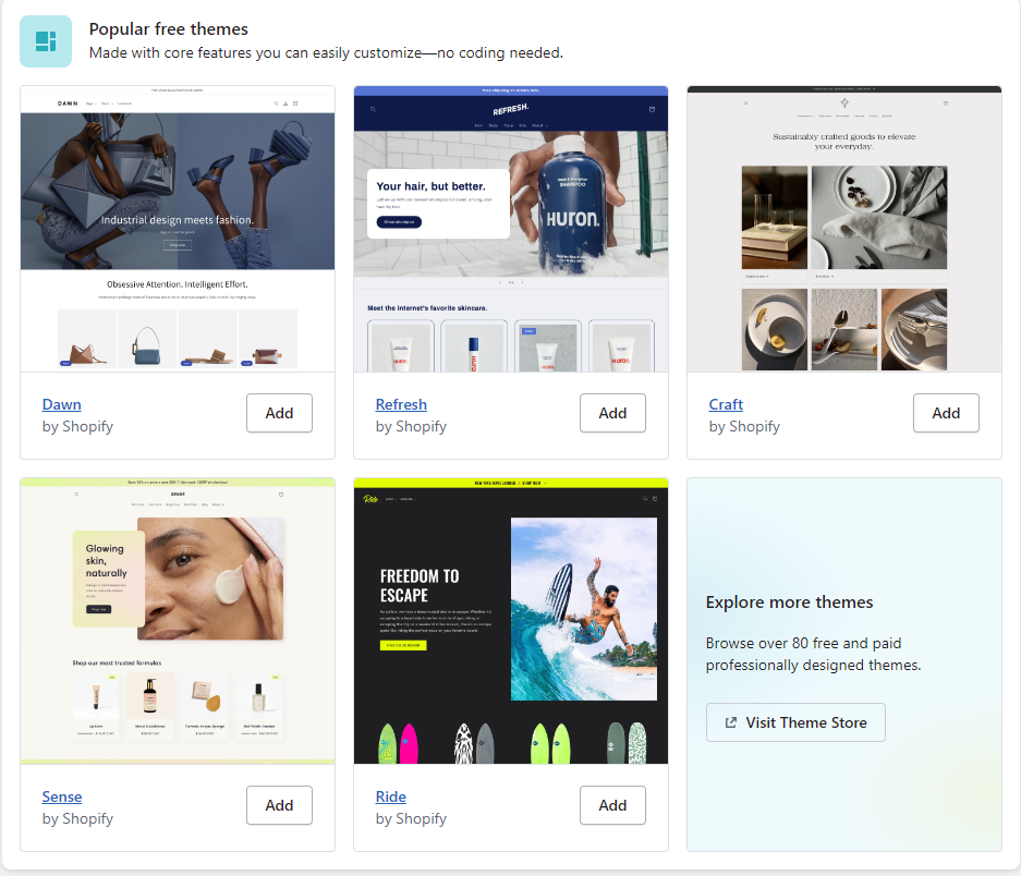 To do this, go to the “Themes” section of your Shopify dashboard, where you’ll be able to choose from a range of free and paid themes.