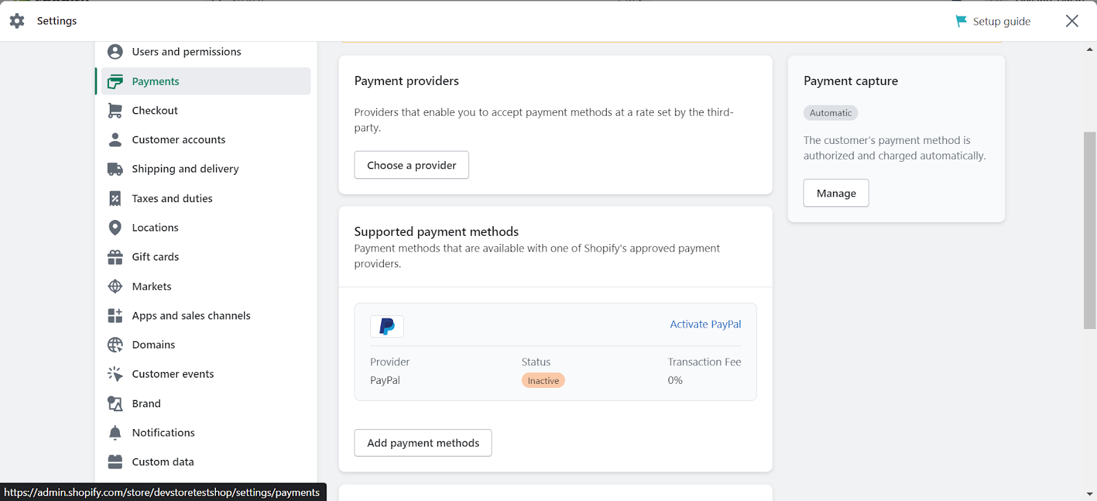 To do this, go to the “Settings” section of your Shopify dashboard and click on “Payments.” Here, you’ll be able to choose from a range of payment processing options, including Shopify Payments, PayPal and more.